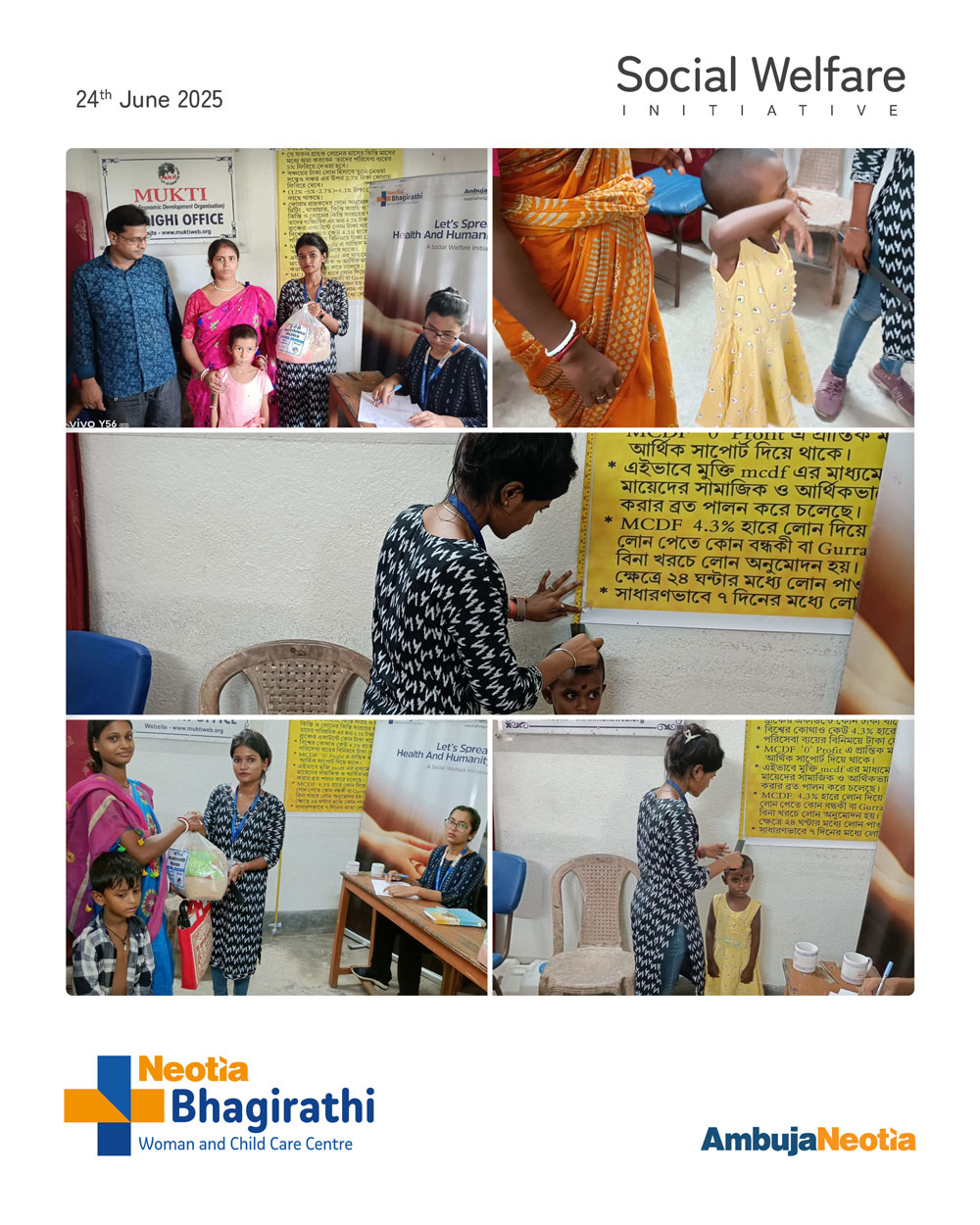 24thJuly, 2025: Neotia Bhagirathi Women and Child Care Centre witnessed a turnout of 100 patients for the General Health Camp held at Sunderban's Purbashreedharpur district. Conducted alongside Mukti, this event was attended by women and children who were provided with a free medical check up, medicines and sanitary napkins.